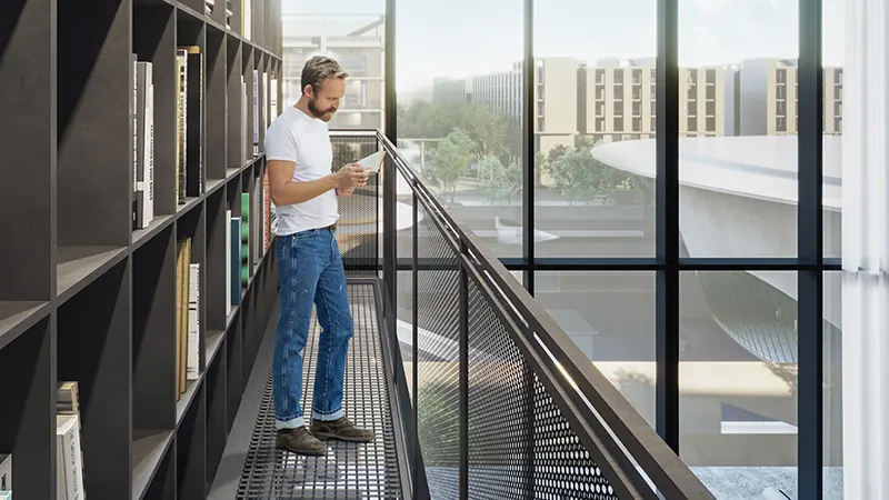 The façade design draws inspiration from Sharjah’s rich cultural heritage, blending the traditional elements with contemporary architecture to create a seamless living environment. The apartments are designed with versatility in mind, offering options with foldable partitions between the living and sleeping areas, allowing residents to create multifunctional spaces. As well the duplex lofts boast elegant double-height living spaces, featuring full glass curtain walls offering panoramic views of the surrounding plazas. The standout features of these residences is the unique double-height wall, which can be customized to showcase the art, books or other creative displays, accessed via a stylish steel bridge.