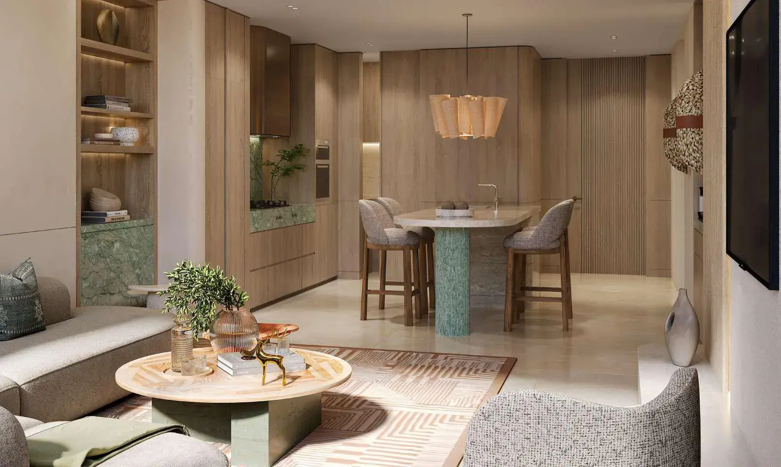 Inside, the residences and villas of Nasim Al Bahr reflect a refined balance of craftsmanship and nature. Interiors are adorned with natural stone, soft metallic accents, and warm timber tones inspired by the hues of dunes and sea. Every space—whether an apartment, villa, or penthouse—has been designed to embrace the light, breeze, and elegance of the setting. Fully equipped kitchens, open living areas, and premium finishes elevate everyday moments into serene experiences of comfort and sophistication.